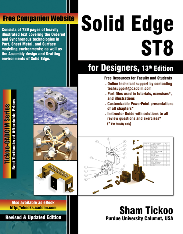 Solid Edge ST8 for Designers textbook introduces the readers to Solid Edge ST8, which is one of the world's leading parametric solid modeling packages. This book consists of 15 chapters structured in a pedagogical sequence, covering the Part, Assembly, Drafting and Sheet Metal environments of Solid Edge ST8. Both Synchronous and Ordered environments are discussed throughout this book. In this textbook, the 3D Sketching is also discussed in both Synchronous and Ordered environments. It combines the speed and flexibility of modeling with precise control of dimension driven design, thereby generating tremendous productivity gains over traditional methods. Additionally, in this textbook, the author emphasizes on the solid modeling and editing techniques that enhance the productivity and efficiency of the users. Every chapter begins with a tools section that provides a brief information of the Solid Edge tools. Each chapter provides you with tutorials that are created using the commands discussed in the chapter. This approach allows the user to use this book initially as a learning tool and then as a reference material.