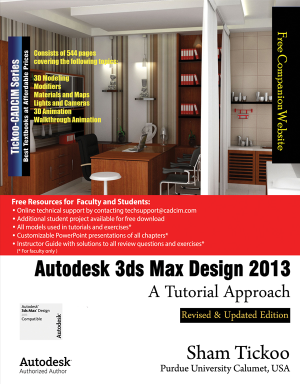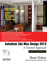 Autodesk 3ds Max Design 2013: A Tutorial Approach textbook introduces the readers to the basic features of 3ds Max Design 2013 through tutorials. The textbook caters to the needs of both the novice and the advanced users of the software. Written with the tutorial point-of-view and the learn-by-doing theme, the textbook is ideally suited for learning at your convenience and pace. This textbook will help you unleash your creativity and help you create simple and complete 3D models and animations. The textbook will help the learners transform their imagination into reality with ease. Following are the additional features of this book: