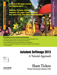 Autodesk Softimage 2013: A Tutorial Approach textbook introduces the readers to the Autodesk Softimage 2013, one of the world�s leading 3D animation and visual effects software. This textbook covers all features of Autodesk Softimage 2013 such as modeling, texturing, lighting, rigid bodies, ICE, Syflex cloth, hair, Lagoa, crowd simulation, and visual effects. It also explains the use of the Face Robot toolset that is used to create different facial expressions. Wide coverage of tools and description of each concept through tutorials as well as the pedagogical arrangement of chapters make this textbook unique in itself. Following are the additional